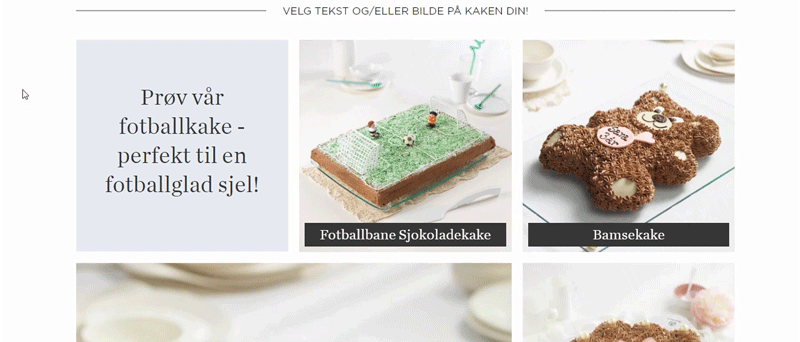 Du har mulighet til å få på egen tekst på flere av kakene våre. Når du velger en av disse vil du få opp et felt som heter «Tekst på kaken». Pass på at det varierer på enkelte kaker hvor mange tegn du kan bruke.