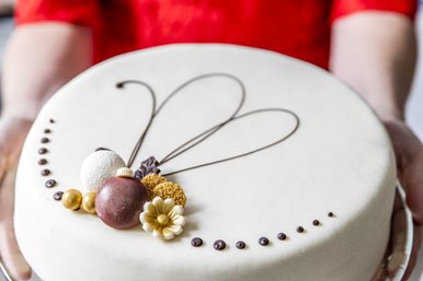 Hvor mye tekst det er plass til er avhengig av størrelsen som er valgt på kaken, men det er generelt liten plass til tekst. VI anbefaler et kort og konsist budskap. Da blir teksten tydelig og pent inkludert i pynten på kaken. Dersom du har en lengre hilsen anbefaler vi å skrive et kort ved siden av kaken.
